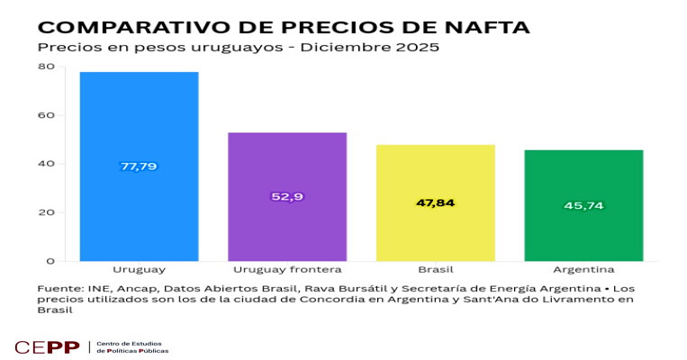 El informe también incorpora una lectura política del diferencial regional. En 2025, la gasolina en Uruguay fue hasta 75% más cara que en Concordia (Argentina) y 60% más costosa que en Sant’Ana do Livramento (Brasil), mientras que el gasoil mostró brechas menores. Para el CEPP, estos diferenciales refuerzan el impacto del esquema de precios sobre la competitividad, especialmente en zonas de frontera.