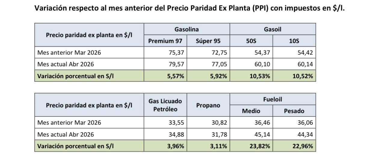La Unidad Reguladora de Servicios de Energía y Agua, publicó el informe de Precios de Paridad de Importación, correspondiente al período del 26 de marzo al 25 de abril, en el que se verifican aumentos significativos en todos los combustibles, consolidando la tendencia alcista observada en marzo.