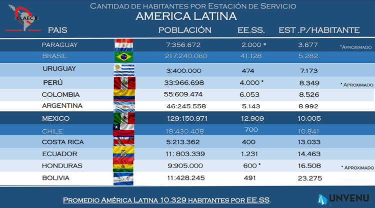 Un estudio dado a conocer por UNVENU, da cuenta que en nuestro país el promedio de estaciones por habitante, está bastante por encima de la media para América Latina, tomando en consideración doce países del continente. La información da cuenta que el promedio en LATAM es de 10.329 personas por cada Estaciones de Servicio.