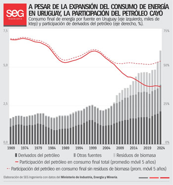 Aunque Uruguay importa la totalidad del petróleo que consume, hoy depende menos de este recurso que en crisis energéticas anteriores. Un análisis de SEG Ingeniería basado en datos del Balance Energético Nacional del Ministerio de Industria, Energía y Minería muestra que los derivados del petróleo representaban cerca del 70 por ciento de la matriz energética en la década de 1970, mientras que actualmente su participación se ubica por debajo del 40 por ciento.