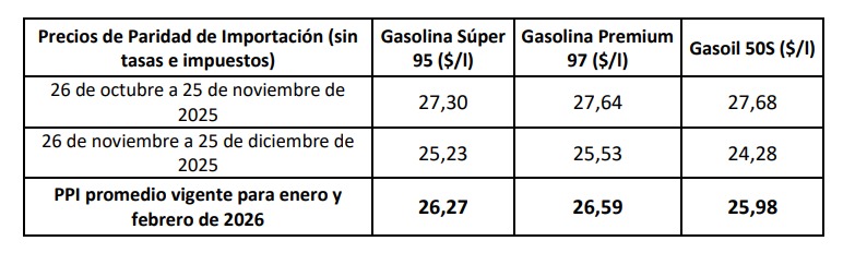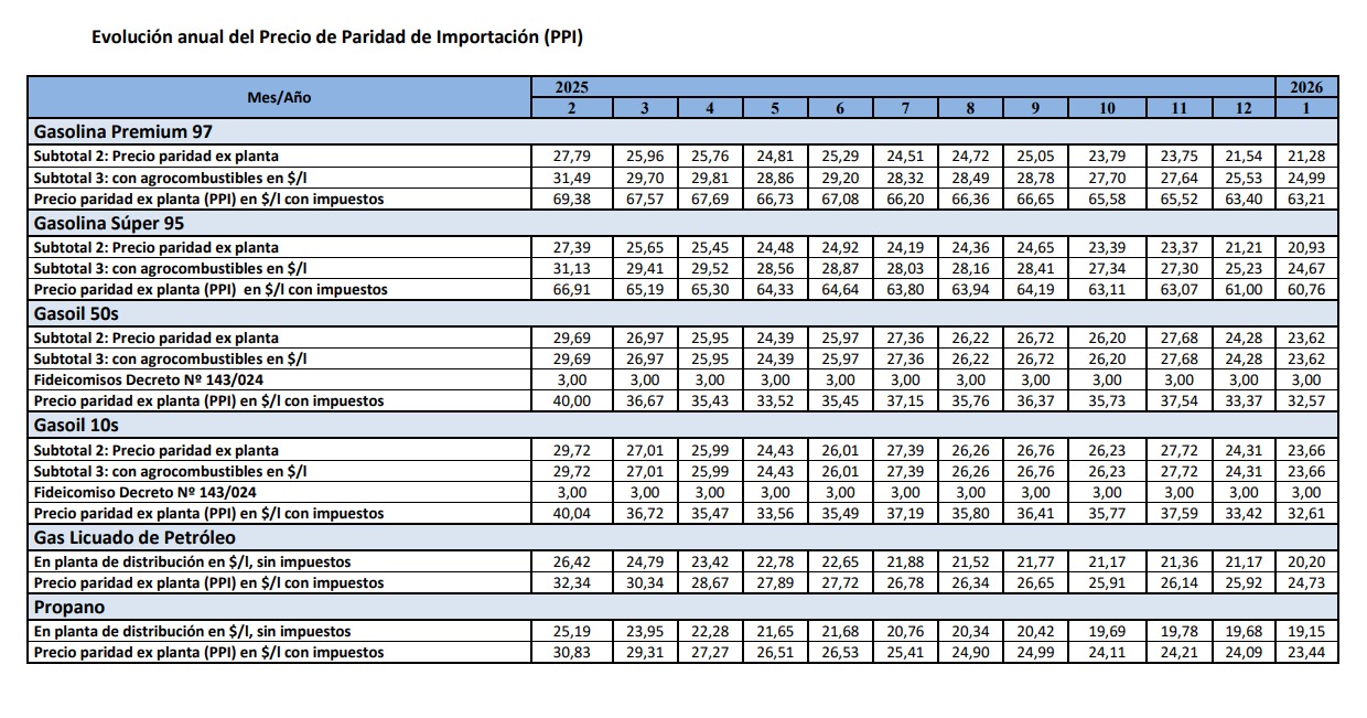 La Unidad Reguladora de Servicios de Energía y Agua dio a conocer este martes su último informe sobre el PPI correspondiente al período comprendido entre el 26 de diciembre de 2025 y el 25 de enero de 2026. Los datos, que sirven de base para la fijación de los precios de los combustibles, muestran una tendencia mayoritariamente descendente en naftas, gasoil y GLP, en un escenario influido por la evolución de los mercados internacionales, la corrección de los costos logísticos y una leve baja del tipo de cambio, factores que comienzan a reflejarse en la estructura de precios del sector.